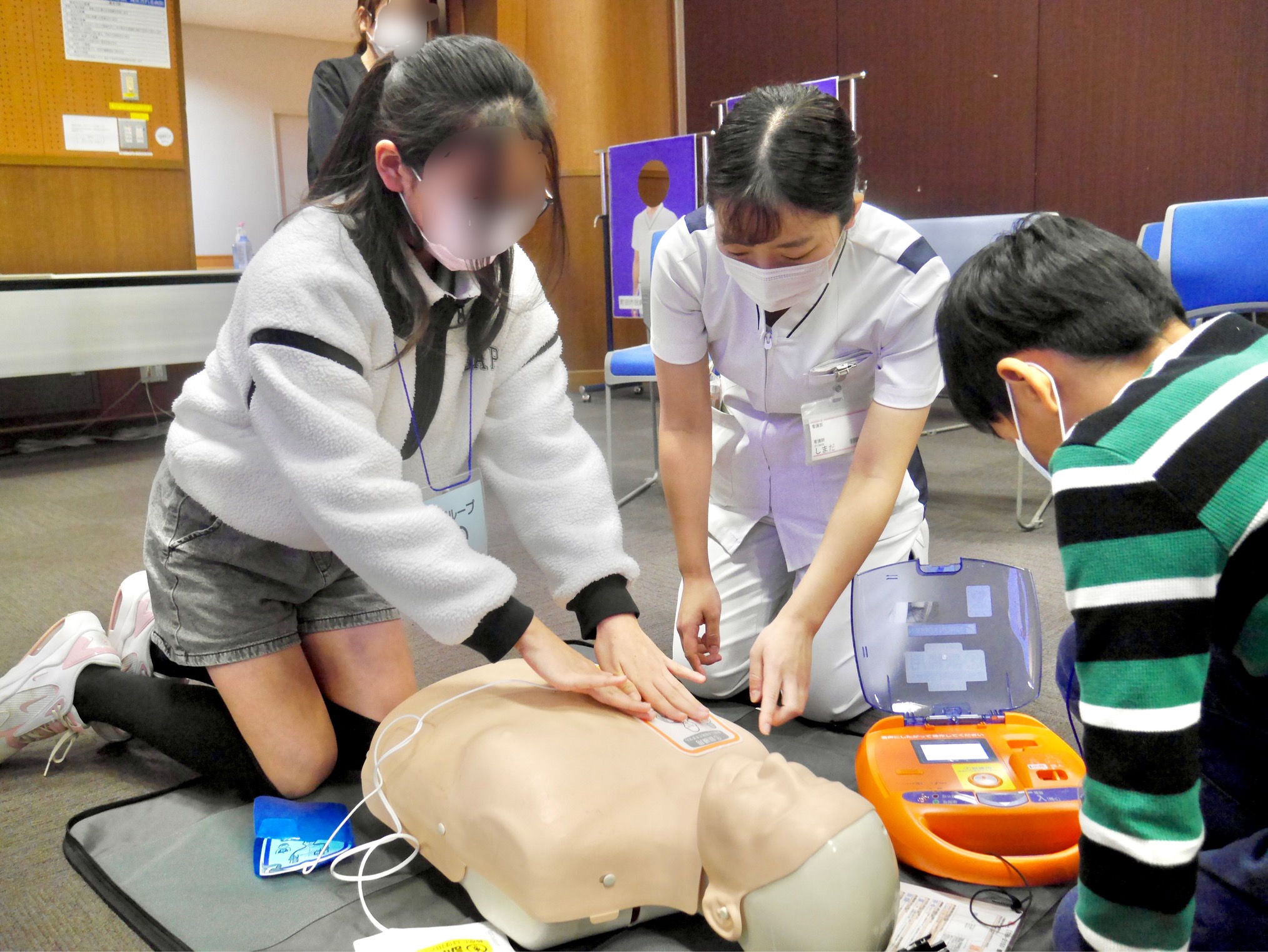 当日は、看護師による心肺蘇生とAED操作訓練、実際に使用している医療機器を使った検査体験、薬剤師による調剤体験、栄養士がつくるゼリーの試食体験など参加型プログラムを中心に行いました。スタッフの説明を真剣な表情で聞いたりする姿が印象的でした。子どもたちからはたくさんの質問があり、スタッフがたじたじとなる場面もありました。病院や看護の仕事への興味を深める貴重な体験となったのではないかと思います。